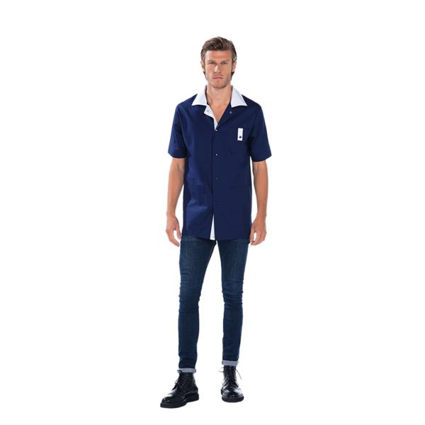 Tunique, manches courtes, fermeture par pressions, 2 poches basses, 1 poche BIP, 1 poche poitrine, fentes côtés, longueur 75 cm