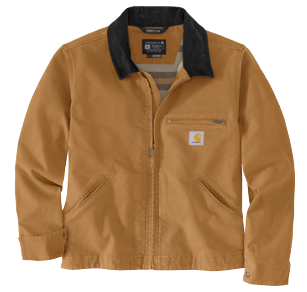 Blouson Cotton Duck stretch Col velours côtelé Poche poitrine côté gauche avec fermeture zip 2 grandes poches avant 2 poches intérieures : 1 à zip et 1 à scratch Fermeture éclair avant YKK® surdimensionnée laiton marquée Carhartt® Poignets ajustables avec boutons Coutures principales triples Etiquette Carhartt® cousue sur la poche poitrine gauche. Composition : 99% coton, 1% élasthanne Doublure : 98% coton/ 2% élasthanne.